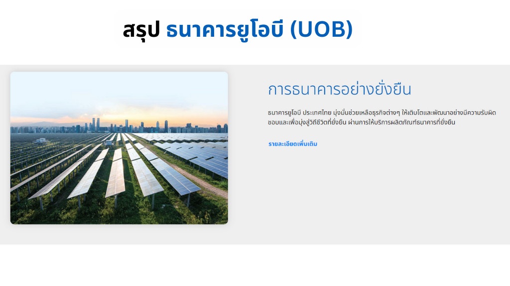 - การมุ่งมั่นสร้างความยั่งยืน : ธนาคารยูโอบี มีนโยบายและแนวปฏิบัติที่ชัดเจน ในการสนับสนุนความยั่งยืน ทั้งในด้านสิ่งแวดล้อม สังคม และการปกครอง มีโครงการต่างๆ เพื่อส่งเสริมและพัฒนาความยั่งยืนในการดำเนินธุรกิจ