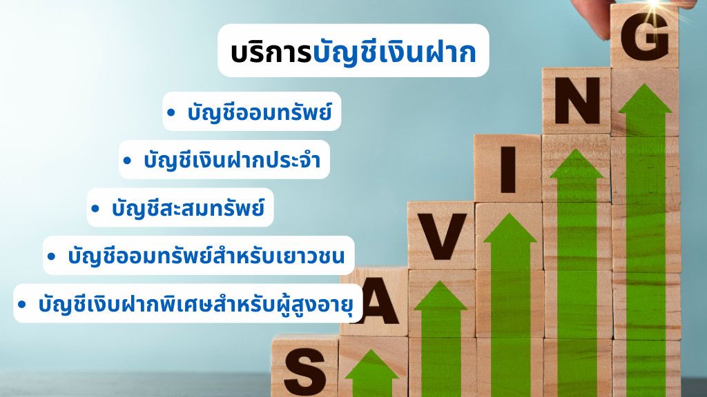 บัญชีออมทรัพย์ : เป็นบัญชีที่มีอัตราดอกเบี้ยแบบเติบโตขึ้นตามเงินฝาก โดยลูกค้าสามารถเข้าถึงเงินของตนได้ง่ายดาย พร้อมกับรับดอกเบี้ยจากการออม