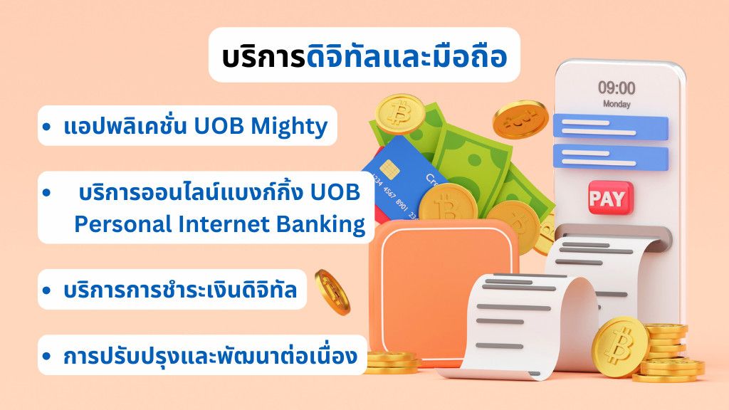 - แอปพลิเคชั่น UOB Mighty : เป็นแพลตฟอร์มที่ช่วยให้ลูกค้าสามารถทำธุรกรรมทางการเงิน ได้ครบวงจรจากมือถือ เช่น การโอนเงิน การชำระบิล การตรวจสอบยอดบัญชี การลงทุน และการจ่ายเงินด้วย QR code นอกจากนี้ยังมีฟีเจอร์เพิ่มเติม เช่น การตั้งค่าการแจ้งเตือน และการวิเคราะห์การใช้จ่าย
