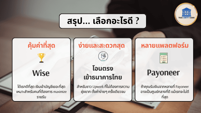 - สำหรับผู้ใช้ Upwork (เน้นง่าย): หากรู้สึกว่าการใช้ Wise ซับซ้อนเกินไป โอนตรงเข้าธนาคารไทยคือตัวเลือกที่ง่ายที่สุด แต่ต้องยอมรับว่าคุณกำลังจ่ายค่าความสะดวกสบายนั้นด้วยต้นทุนแฝงในอัตราแลกเปลี่ยนประมาณ 3-5%