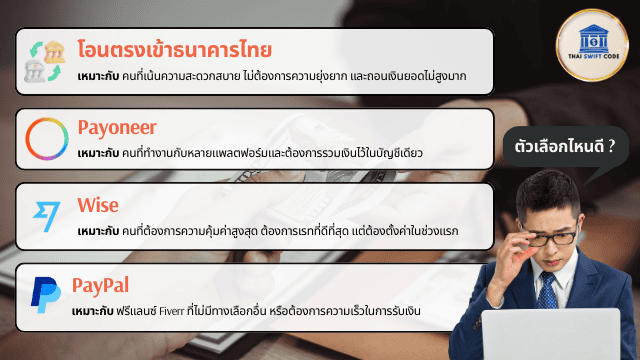 - การโอนตรงเข้าธนาคารไทยจาก Upwork แม้จะดูง่าย แต่มีต้นทุนแฝงจากอัตราแลกเปลี่ยนสูง ขณะที่ PayPal เป็นวิธีที่เร็วที่สุดแต่ก็แพงที่สุดเช่นกัน